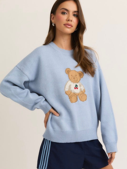 Long Sleeve Crew Neck Sweater With Teddy Bear